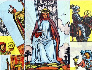 また、コートカード(ペイジ、ナイト、クイーン、キング)もそれぞれ意味を持っており、その意味とスートの意味を組み合わせて暗示を読む。